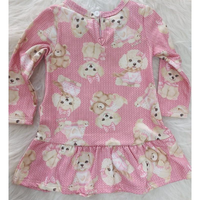 VESTIDO MANGA LONGA EM MALHA TERMOSKIN COM ESTAMPA DOGS, BABADO NA BARRA DETALHES COM STRASS E ABERTURA NAS COSTAS MARCA KUKIE