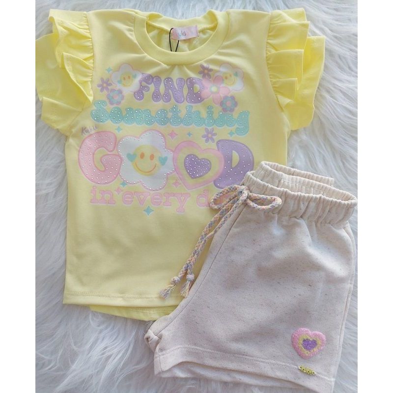 CONJUNTO FEMININO INFANTIL COMPOSTO POR BLUSA MANGA CURTA COM BABADO EM MEIA MALHA AMARELA COM ESTAMPA E SHORTS EM MOLETOM SEM FELPA COM ELASTICO NA CINTURA E CORDAO DE AJUSTE MARCA KUKIE