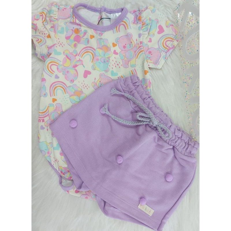 CONJUNTO DE BODY MANGA CURTA EM MALHA COMFY COM ESTAMPA COLORIDA DE URSINHOS E ARCO IRIS E SHORTS SAIA EM MOLETOM SEM FELPA DECORADO COM POMPOM, COM ELASTICO E CORDAO DE AJUSTE NA CINTURA NA COR LILAS MARCA KUKIE