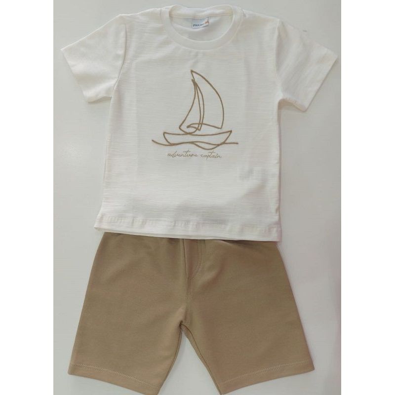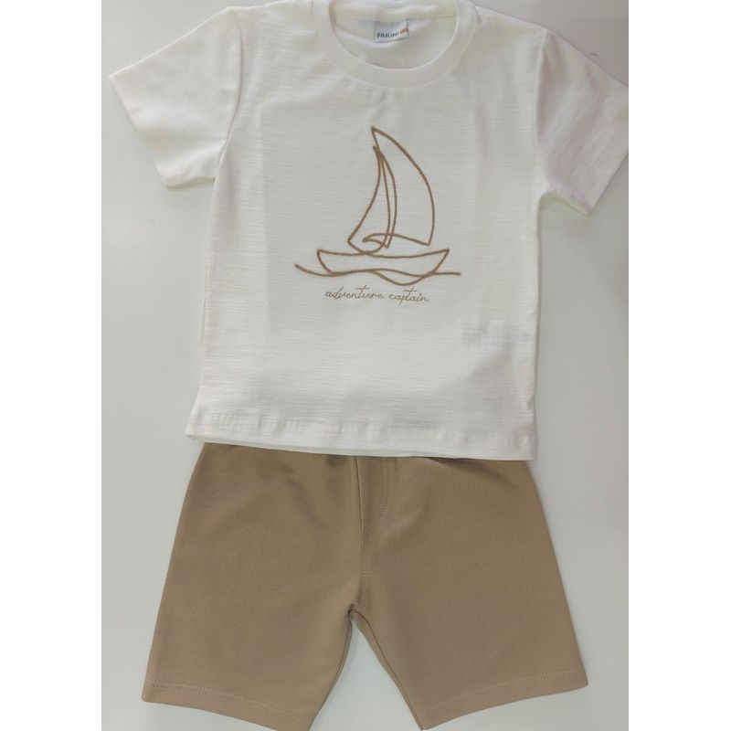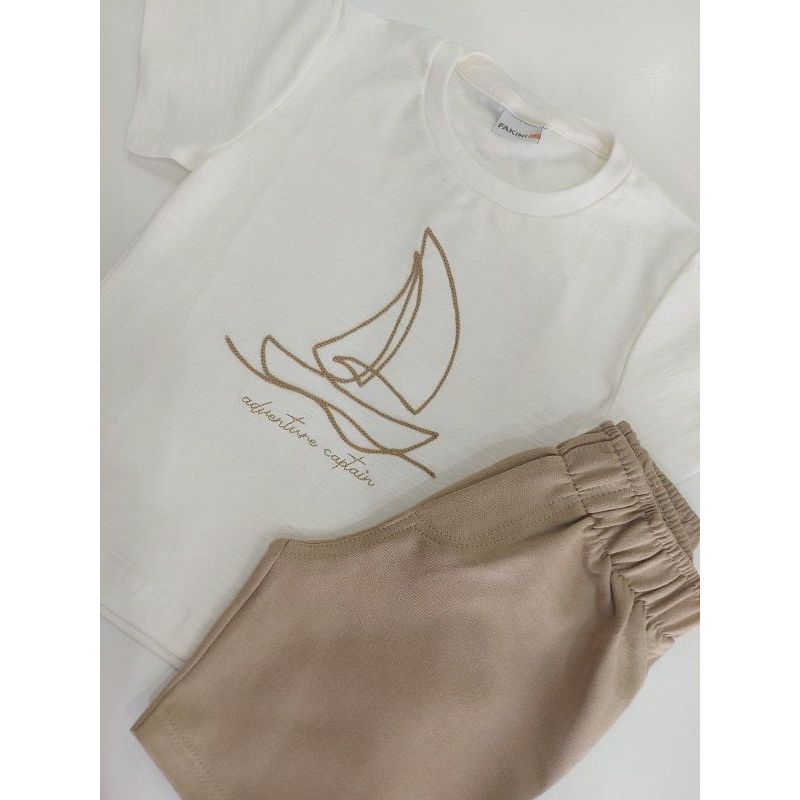 CONJUNTO INFANTIL MASCULINO COMPOSTO POR CAMISETA MANGA CURTA EM MALHA COM BORDADO EM MOLETINHO SEM FELPA COM ELASTICO DE AJUSTE NA CINTURA FAKINI