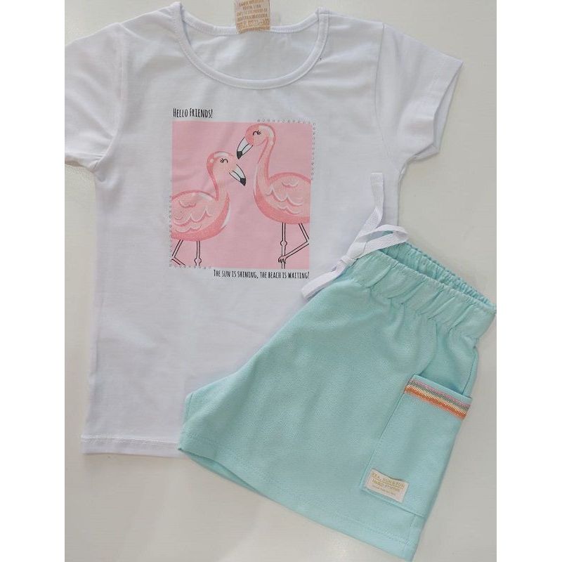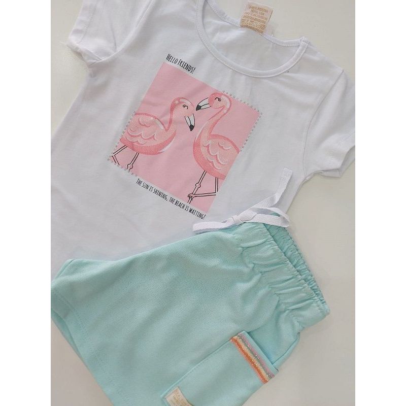CONJUNTO INFANTIL FEMININO COMPOSTO POR BLUSA MANGA CURTA EM MALHA NA COR BRANCA COM ESTAMPA FLAMINGOS COM DETALHES EM STRASS E SHORTS EM MOLETINHO SEM FELPA NA COR AZUL PISCINA COM BOLSO LATERAL E ELASTICO NA CINTURA MARCA LANFEL