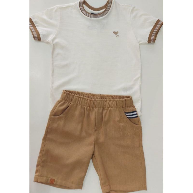CONJUNTO COMPOSTO POR CAMISETA MANGA CURTA OFF WHITE, COM BORDADO, PUNHO NAS MANGAS E DECOTE E BERMUDA EM LINHO NA COR BEGE COM BOLSO FRONTAL MARCA LANFEL