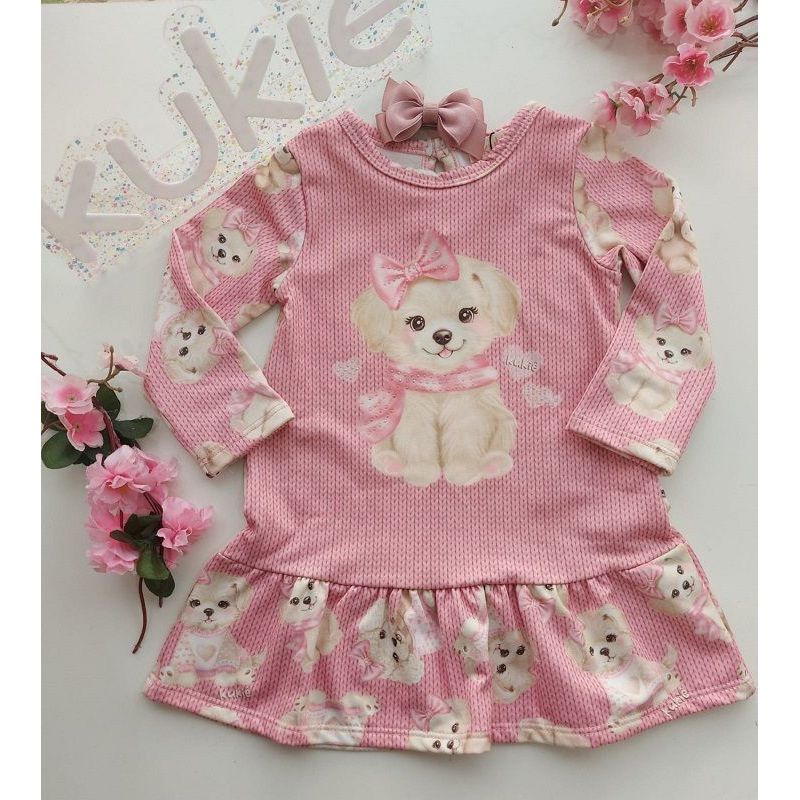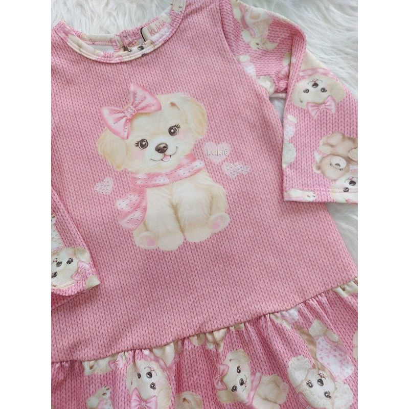 VESTIDO MANGA LONGA EM MALHA TERMOSKIN COM ESTAMPA DOGS, BABADO NA BARRA DETALHES COM STRASS E ABERTURA NAS COSTAS MARCA KUKIE