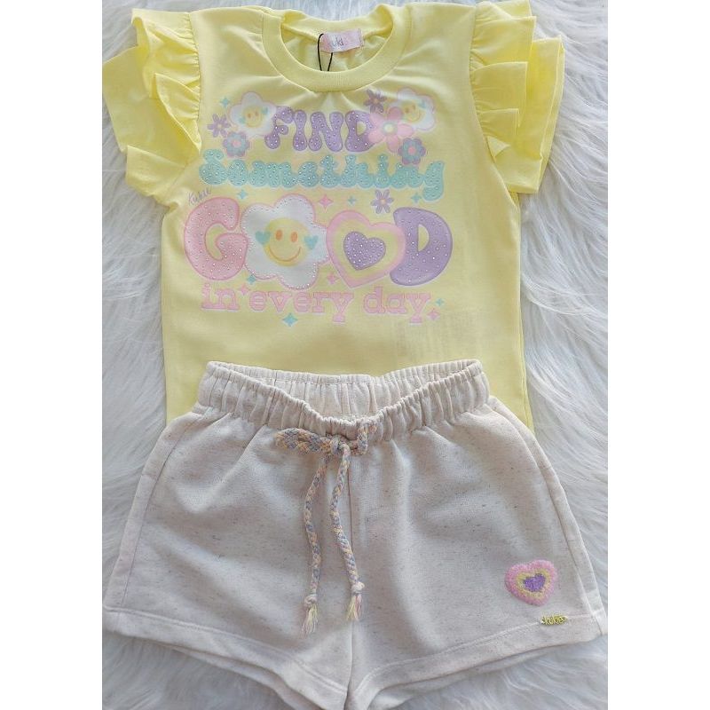 CONJUNTO FEMININO INFANTIL COMPOSTO POR BLUSA MANGA CURTA COM BABADO EM MEIA MALHA AMARELA COM ESTAMPA E SHORTS EM MOLETOM SEM FELPA COM ELASTICO NA CINTURA E CORDAO DE AJUSTE MARCA KUKIE