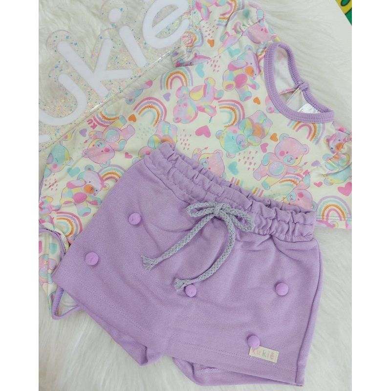 CONJUNTO DE BODY MANGA CURTA EM MALHA COMFY COM ESTAMPA COLORIDA DE URSINHOS E ARCO IRIS E SHORTS SAIA EM MOLETOM SEM FELPA DECORADO COM POMPOM, COM ELASTICO E CORDAO DE AJUSTE NA CINTURA NA COR LILAS MARCA KUKIE