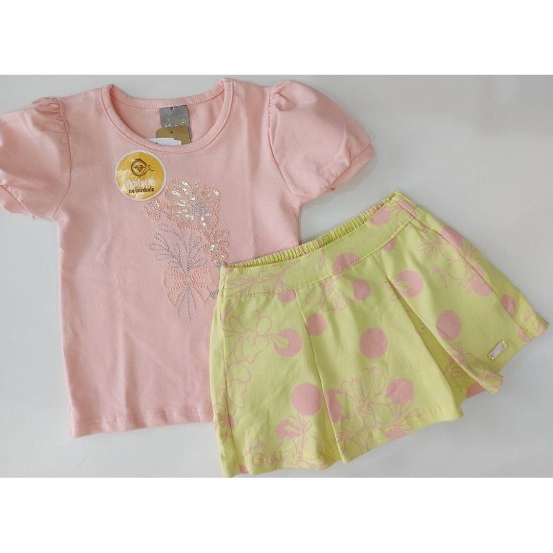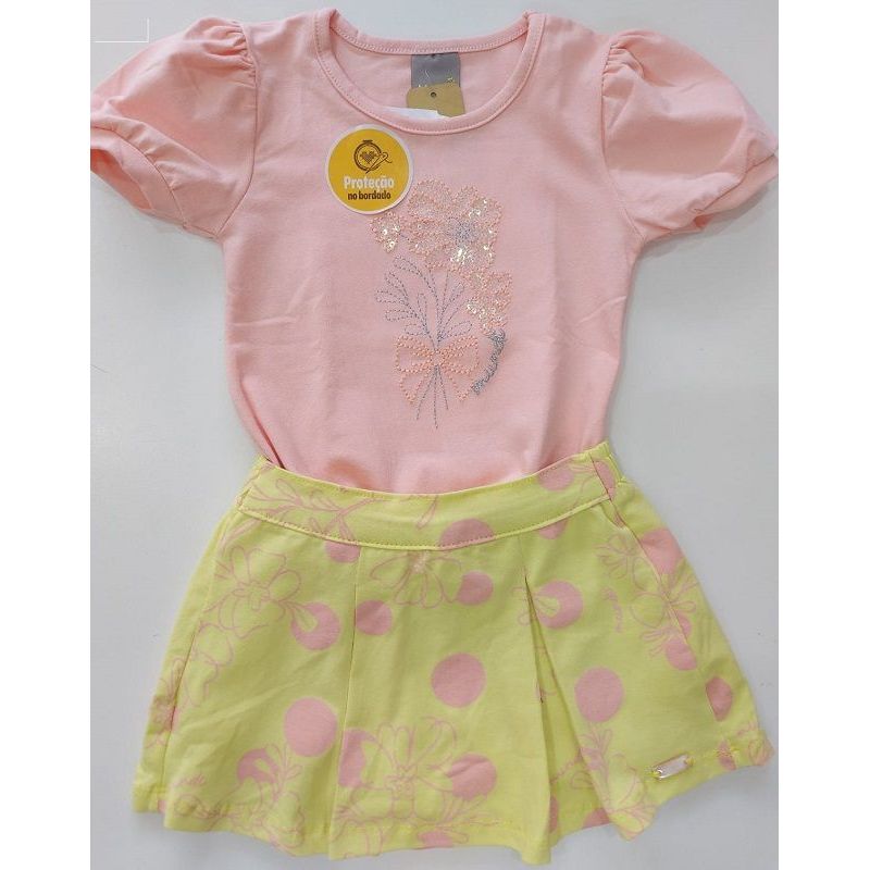 CONJUNTO BLUSA MANGA FOFA EM MALHA COTTON COM PROTEÇÃO NO BORDADO E SHORTS SAIA COM PREGA EM MALHA COTTON ESTAMPADA BRANDILI MUNDI