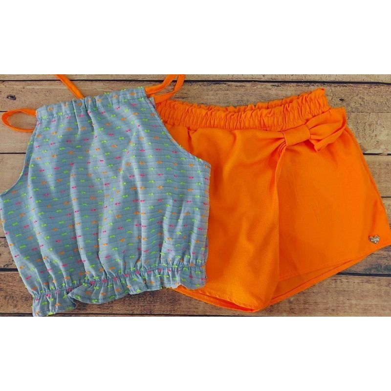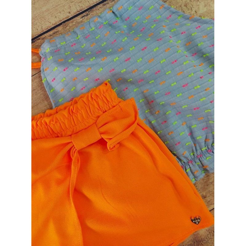 CONJUNTO BLUSA CROPPED EM TRICOLINE DOTS DETALHE NEON ALCA COM REGULAGEM NAS COSTAS E SHORTS SAIA EM CREPE SAN PETER MARCA KUKIE