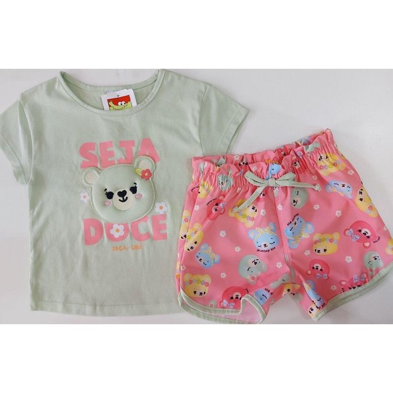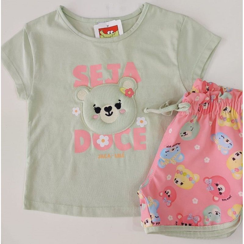 CONJUNTO BLUSA EM MALHA MANGA CURTA COM ESTAMPA SEJA DOCE E APLIQUE URSINHO COM ENCHIMENTO/SHORTS EM MICROFIBRA COM ESTAMPA URSINHOS AJUSTE COM ELASTICO NA CINTURA E CORDAO DECORATIVO MARCA JACA LELE