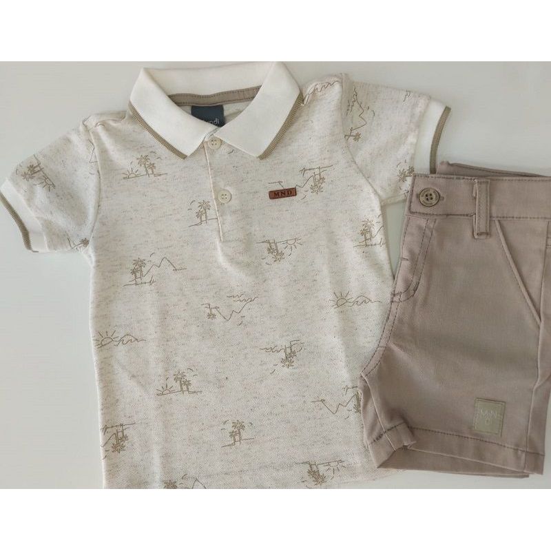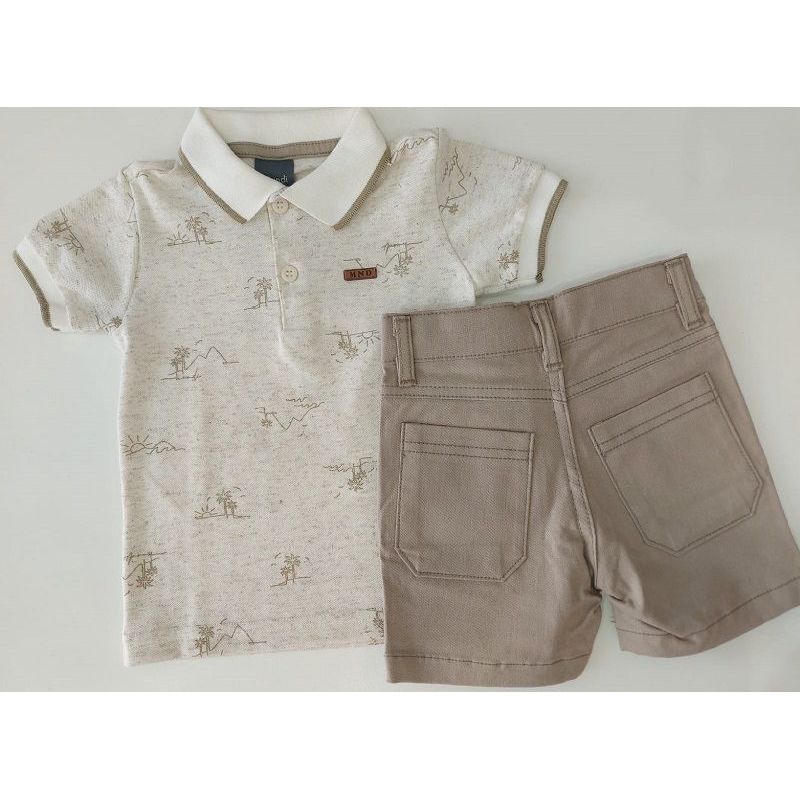CONJUNTO CAMISA POLO OFF WHITE COM ESTAMPA SUAVE EM TOM MARROM E BERMUDA COM BOLSOS FRONTAIS E ATRAS EM SARJA MARCA BRANDILI MUNDI