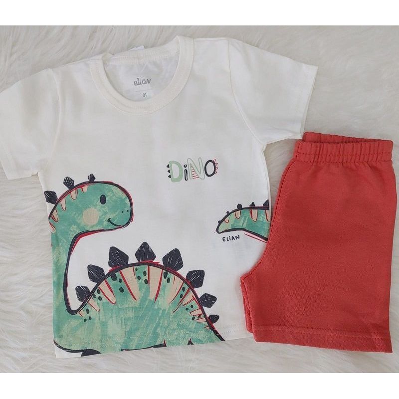 CONJUNTO INFANTIL MASCULINO CAMISETA MANGA CURTA EM MALHA COM ESTAMPA DINO E BERMUDA EM MOLETOM COM ELASTICO NA CINTURA MARCA ELIAN