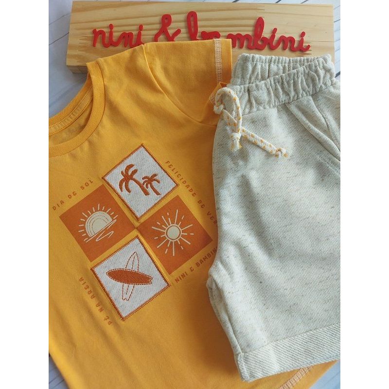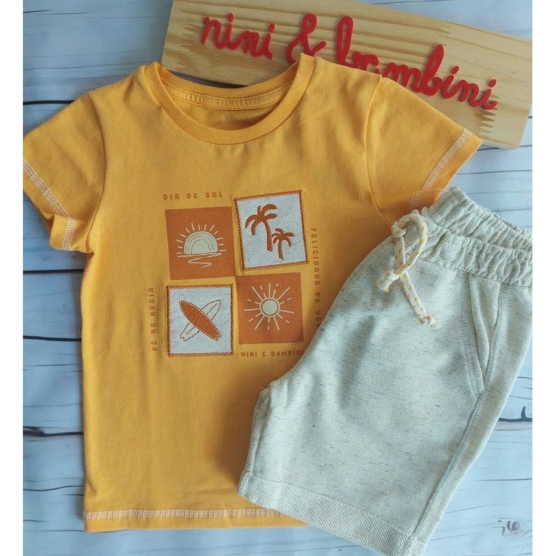 CONJUNTO CAMISETA MANGA CURTA EM MALHA COM ESTAMPA E BORDADO QUE REMETEM AO VERAO EM CORES VIBRANTES QUE CONTRASTAM COM A BERMUDA EM LINHO EM TOM CLARO. A BERMUDA POSSUI BOLSO E ELASTICO NA CINTURA PARA MAIOR CONFORTO E CORDAO DE ENFEITE MARCA NINI & BAMBIN