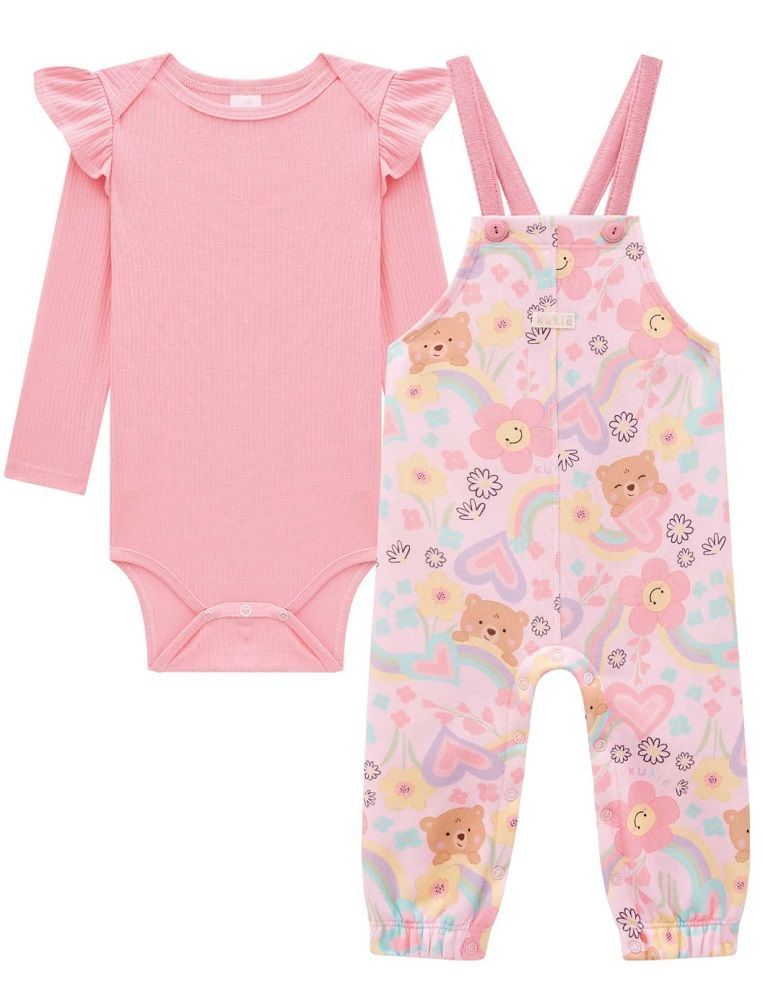 CONJUNTO BODY ML CANELADO E JARDINEIRA MOLETOM FLANELADO ESTAMPADO ALCA COM AJUSTE KUKIE