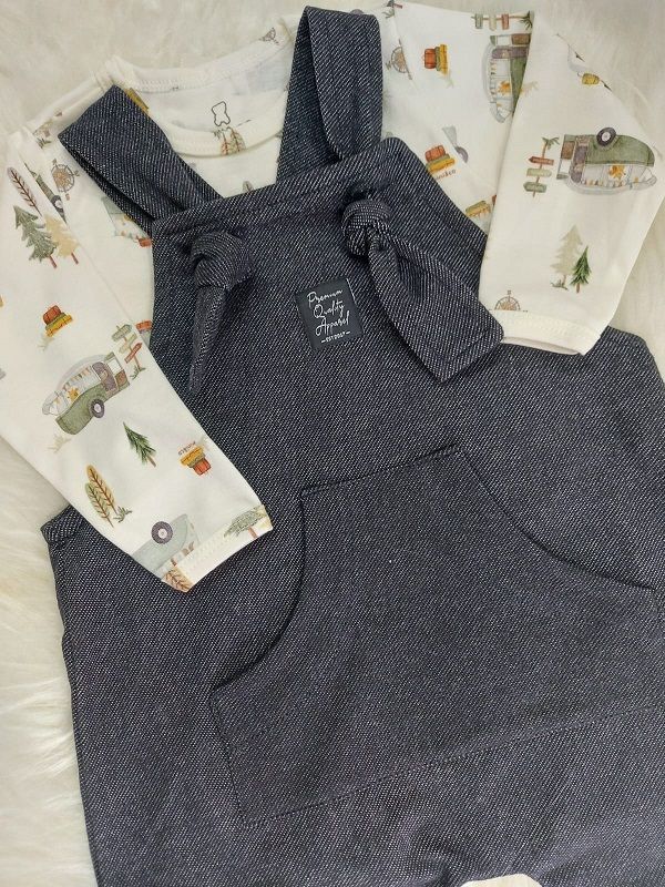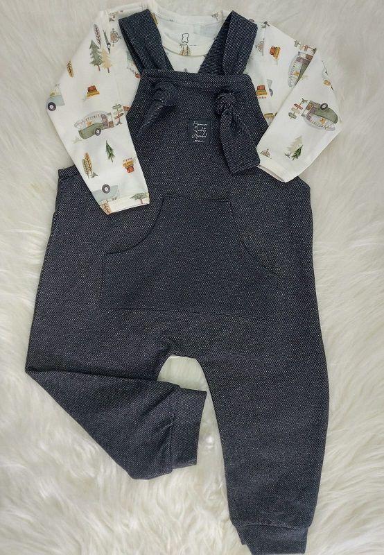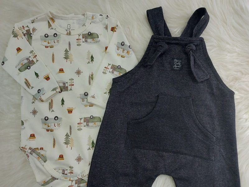 CONJUNTO BODY MANGA LONGA ESTAMPADO ALGODAO FIO EGIPIO ULTRA SOFT E JARDINEIRA COM REGULAGEM NA ALCA BOLSO CANGURU 64% ALGODAO 5% ELATANO E 5% LINHO