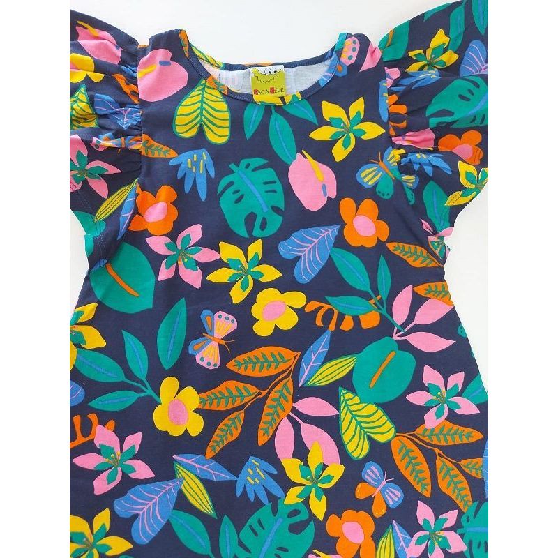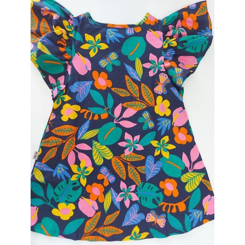VESTIDO INFANTIL EVASE EM MALHA COM ESTAMPA TROPICAL. AS MANGAS POSSUEM UM VOLUME ACENTUADO E LEVE FRANZIDO MARCA JACA LELE