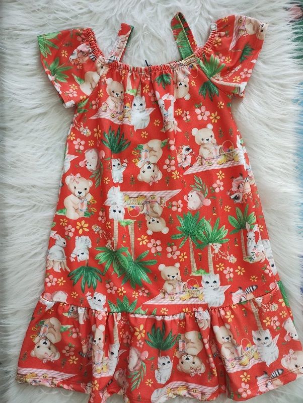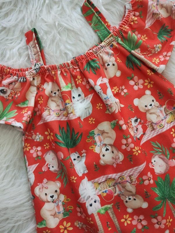 VESTIDO MANGA CIGANA, ESTAMPA URSO PIQUENIQUE, EM MALHA 96% PLYESTER E 4% ELASTANO, COM BABADO NA BARRA